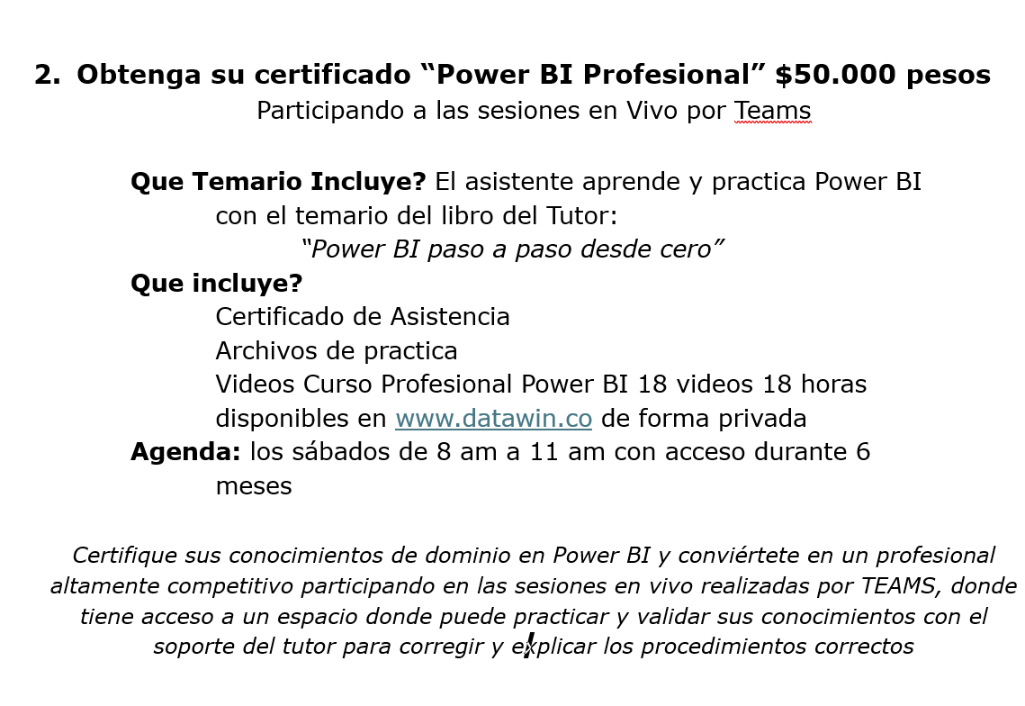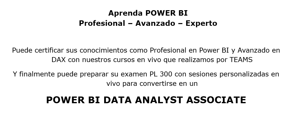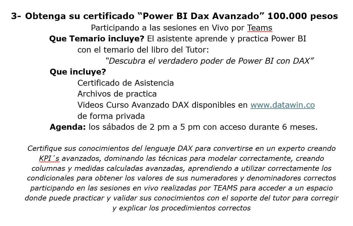 SESIONES EN VIVO: Acceso a los cursos Power BI Profesional y Dax Avanzado sábados de 8 am a 11 am y de 2 pm a 5 pm con sesiones en vivo por TEAMS para aprender y practicar los temas que requiere un profesional al implementar proyectos reales, permitiendo dominar las habilidades y destrezas en la preparación de datos con Power Query, el modelamiento de datos desde su correcta definición y creación de los modelos semánticos, la elaboración de cálculos avanzados de DAX para crear KPI´s avanzados y practicar todas las habilidades requeridas para crear los informes interactivos de tal forma que los usuarios finales puedan analizar la información de forma sencilla y útil